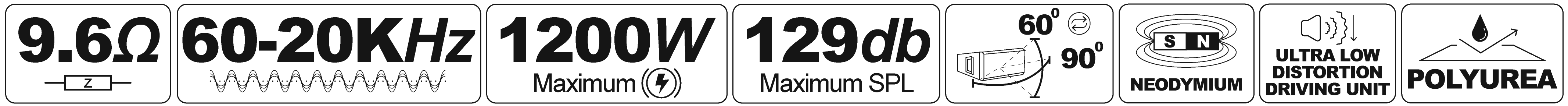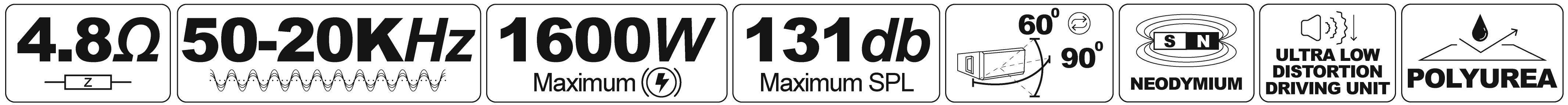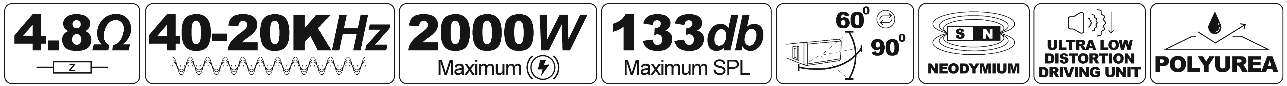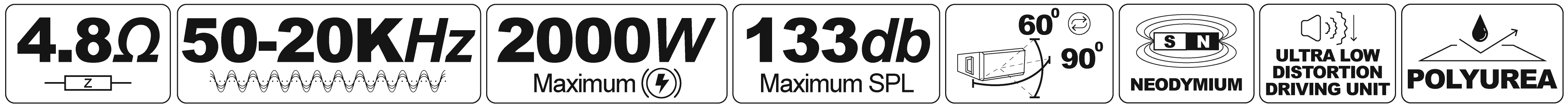 Trở kháng 4.8Ω, độ nhạy 133db, công suất 2000W