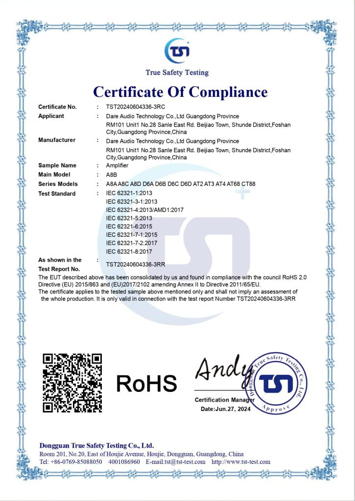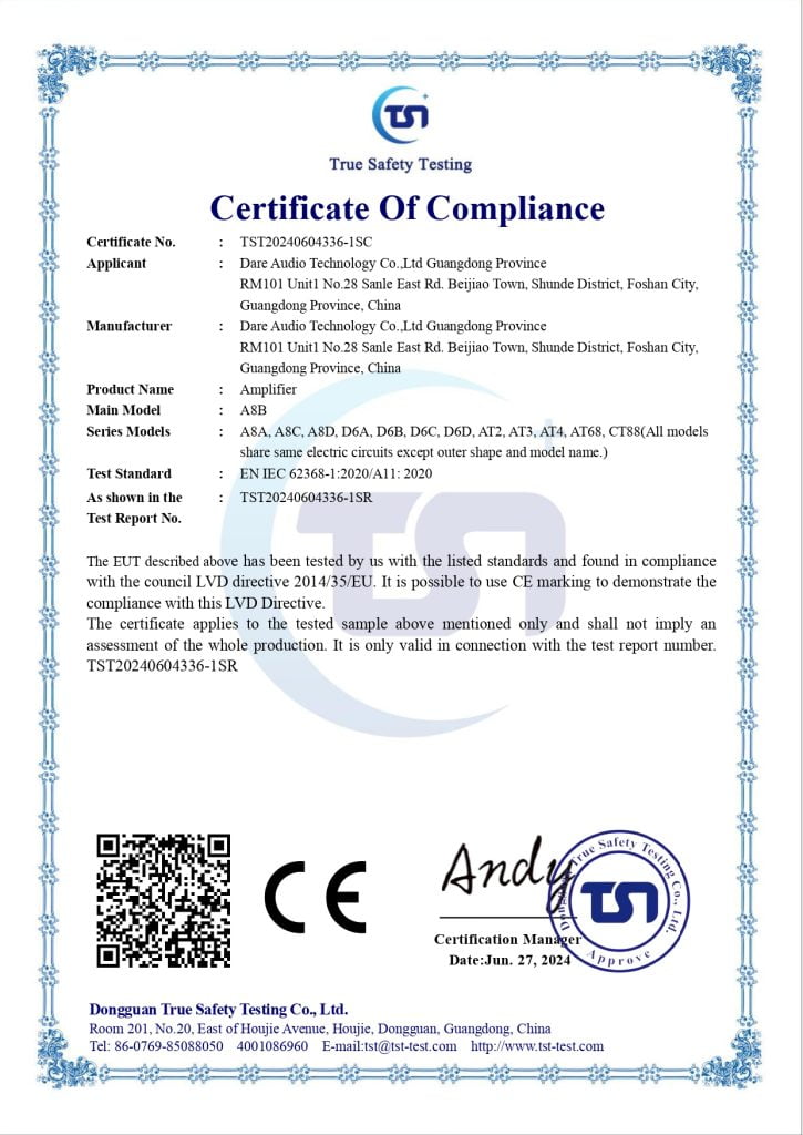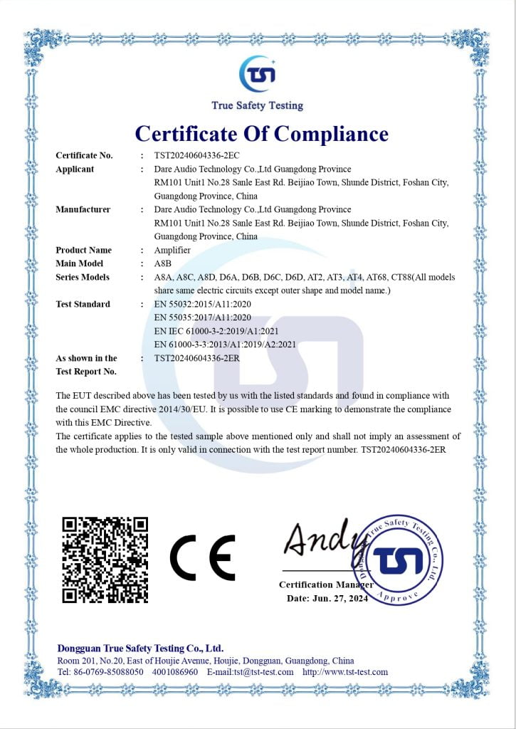 Là thương hiệu nghiên cứu, phát triển và sản xuất các sản phẩm thiết bị âm thanh chuyên nghiệp, Dare Audio luôn đặt chất lượng là yếu tố hàng đầu và then chốt trong suốt quá trình này. Sản phẩm trước khi đưa ra thị trường đã vượt qua 03 vòng kiểm tra chất lượng của RoHS, CE-EMC Directive và CE-LVD Directive.